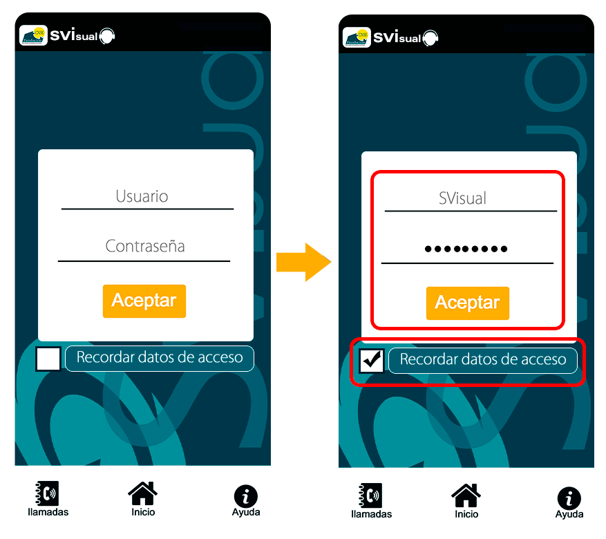 2Una vez abierta la App, para poder realizar una llamada debes introducir tus datos de acceso al servicio SVIsual en los campos de “Usuario” y “Contraseña” y pulsar en el botón “Aceptar”. Los datos de “Usuario” y “Contraseña” son los mismos que utilizas para el acceso web.