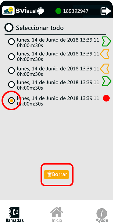 Para borrar del historial el registro de una llamada concreta, márcala pulsando sobre el círculo negro de la izquierda y pulsa en el botón “Borrar”.